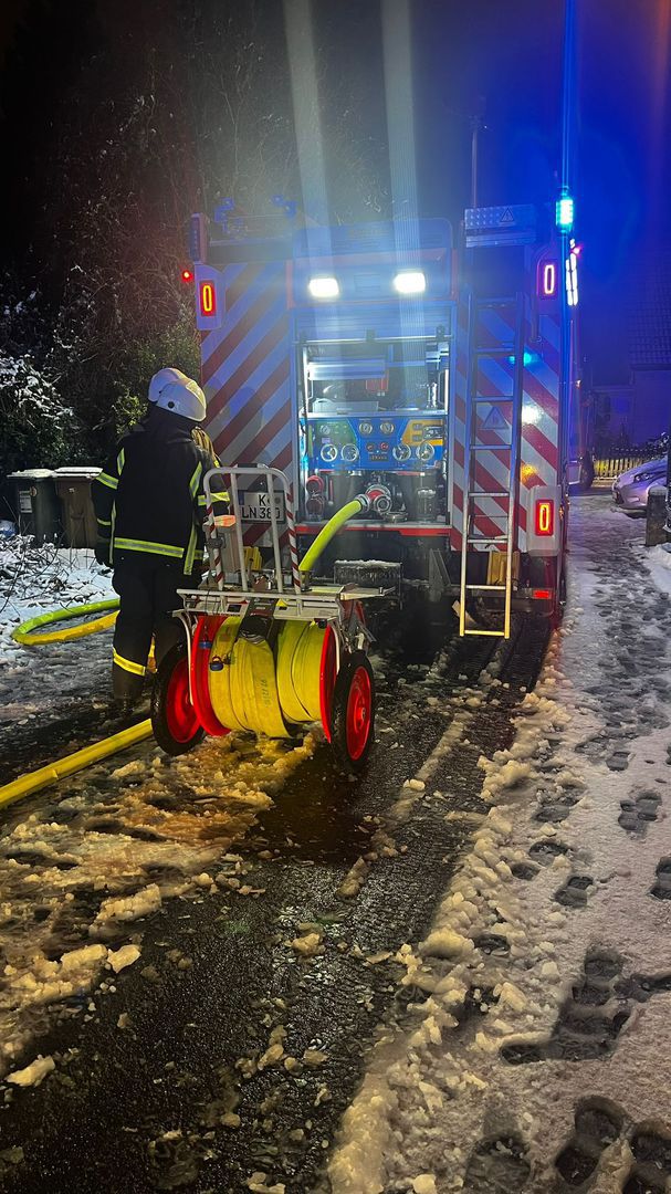 In der Nacht zum Sonntag, 11. Januar 2026 wurden wir um 03:42 Uhr mit dem Einsatzstichwort LAUBE in eine Kleingartenanlage nach Chorweiler alarmiert. Der Einsatz lief mit Kräften der Berufs- und Freiwilligen Feuerwehr bereits seit einiger Zeit. Unsere Aufgabe war es, die für die erforderliche Wasserversorgung verlegten Schläuche (über 300m) zurückzubauen. In der kalten Winternacht gefror das aus den Schläuchen laufende Wasser blitzschnell. Erfreulich war, dass Anwohner den Einsatzkräften warme Getränke anboten. Danke dafür!